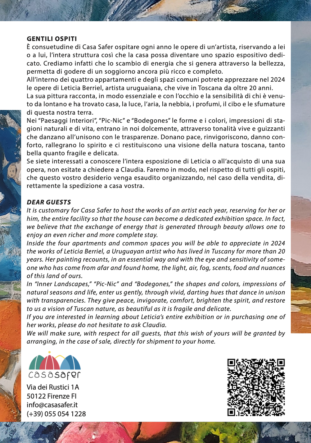 The “Whale’s Belly” is a common space that every guest can use. Going down the stairs, you will find a small winter garden (LED lights are energy-efficient), a sitting area, a desk to connect your laptop, a small gym, and a laundry room. In addition, you will have access to publications that will be useful for discovering Florence, with updates on ongoing events, and you can appreciate the proposals of emerging artists that we regularly host.